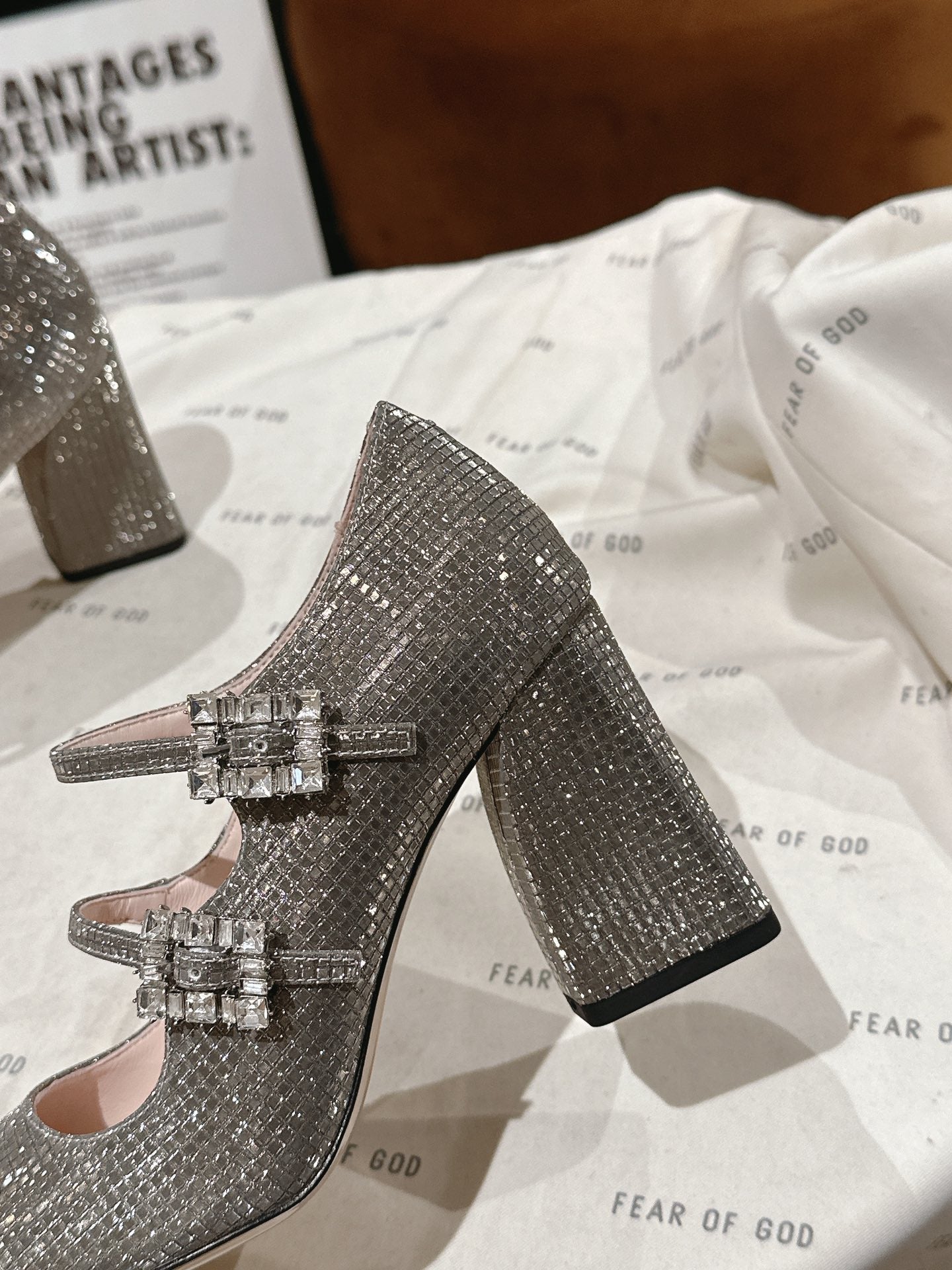 TRÈS VIVIER MARY JANE DOUBLE-STRAP PUMPS IN TAUPE CALFSKIN FULLY EMBELLISHED CRYSTALS