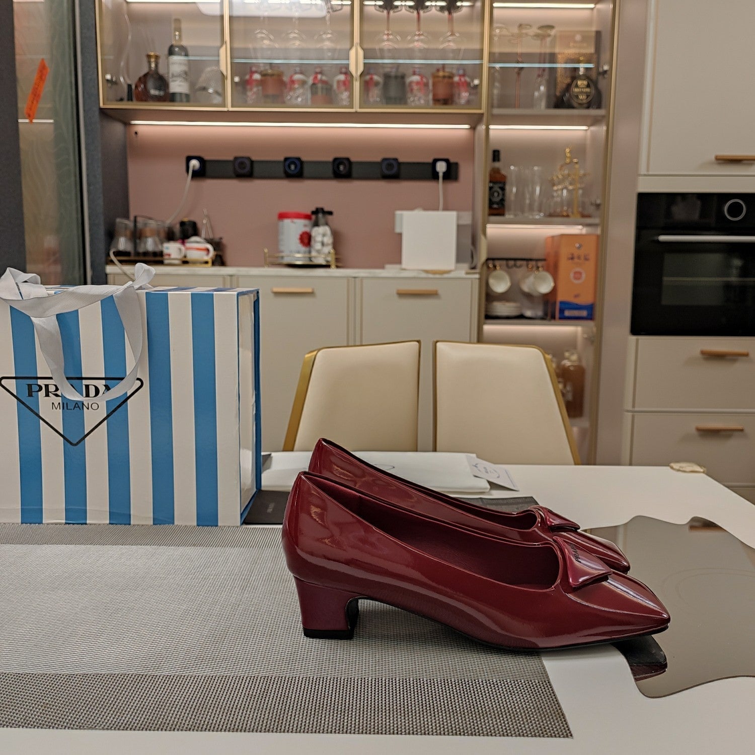 TRIANGLE LOGO PUMPS IN CURRANT RED GLOSSY CALFSKIN
